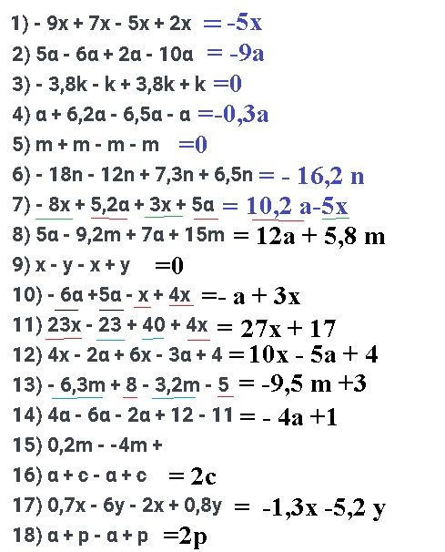 Приведите подобные слагаемые 1) - 9х + 7х - 5х + 2х