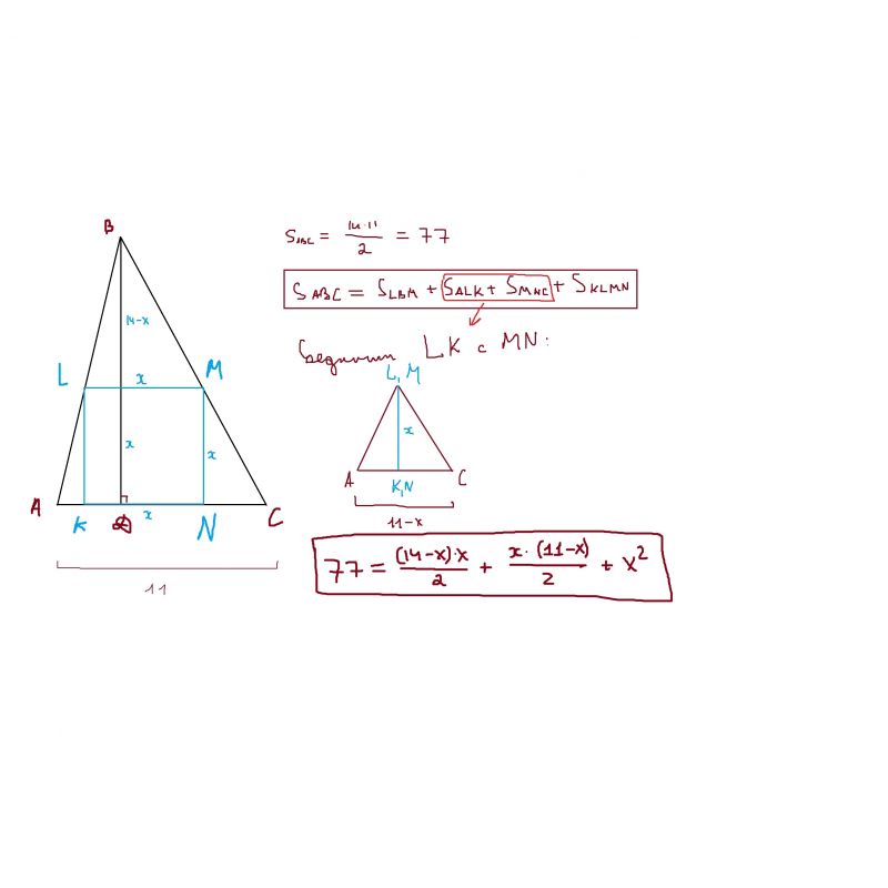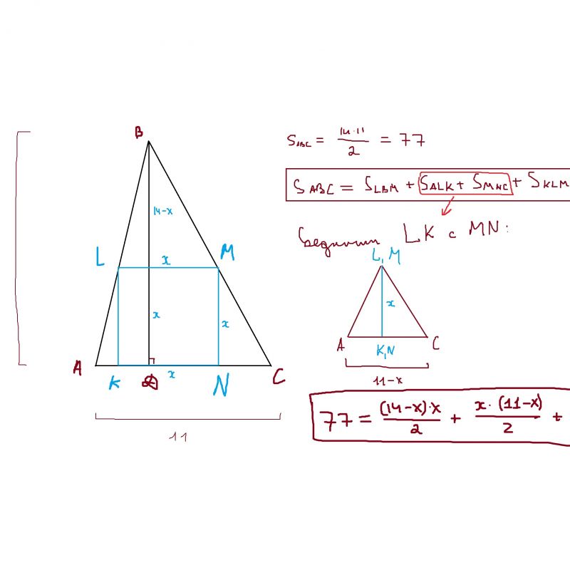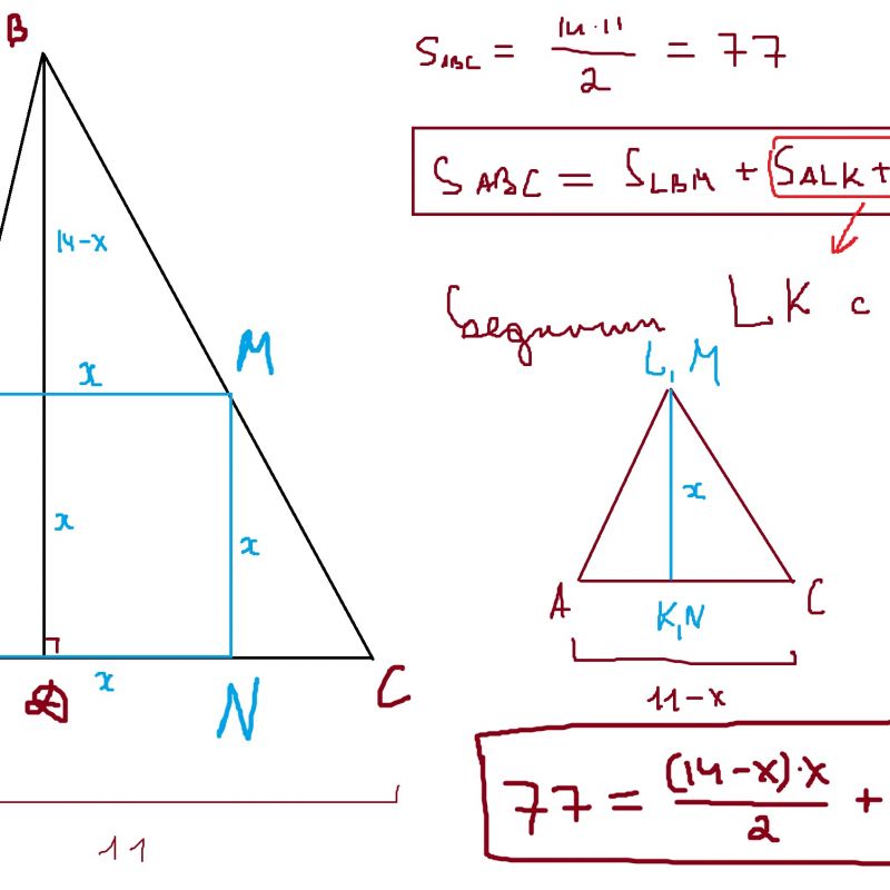 Геометрия. Найти длины сторон квадрата В треугольник с основанием АС=11см и высотой ВD= 14 см вписан квадрат KLMN так, что сторона КN лежит на основании АС, а вершины L и M - соответственно на сторонах АВ и ВС. Определи длину стороны квадрата.