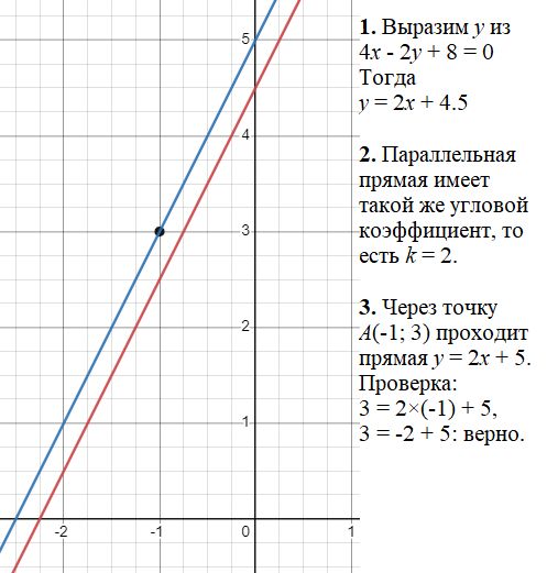 Составьте уравнение прямой, проходящей через точку А(-1;3) параллельно прямой 4х-2у+8=0