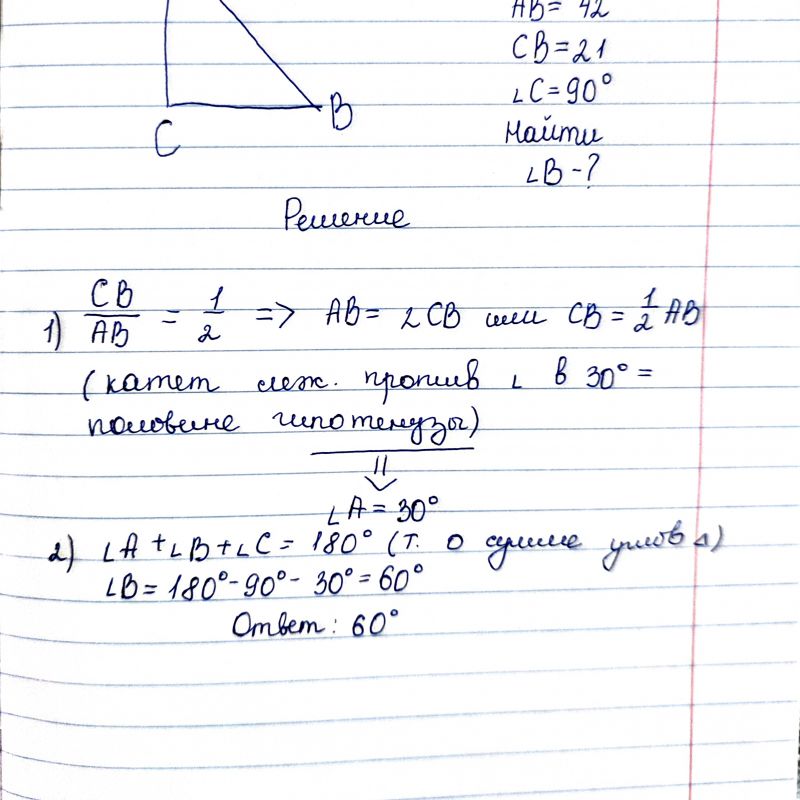 Дан прямоугольный треугольник abc, ab=42 cb=21 c=90° найдите угол b