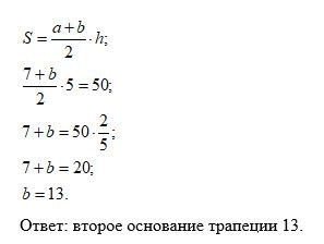 второе основание трапеции. Основание трапеции равно 7, высота равна 5, а площадь равна 50. Найдите