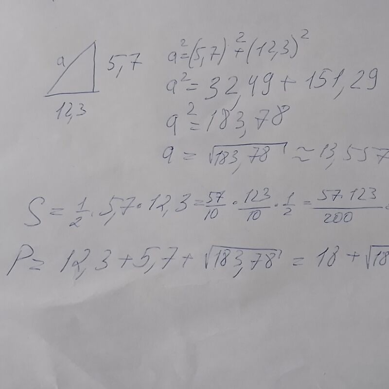 одна сторона a=5,7 a = 5,7 a=5,7 дм,другая сторона b=12,3 b = 12,3 b=12,3 дм.Теперь подставим значения в формулы: