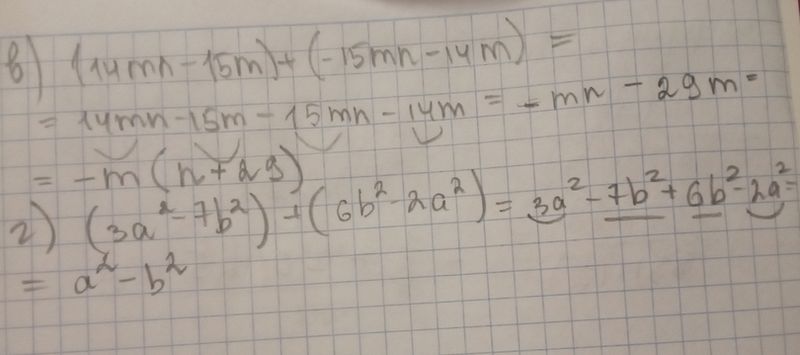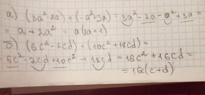 Выполните сложение: а) ( 3 а²- 2 а)+ ( -а²+ 3 а), б) ( 6 с² - 2 сd) + ( 10 c²+ 18 cd), в) ( 14 mn - 15 m) + ( - 15 mn - 14 m) , г) ( 3а² - 7b²) + ( 6b² - 2а²).