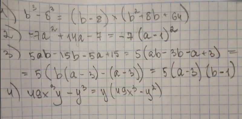 Разложите на множители: 1) b в 3 степени-8 в 3 степени; 2) 49x в 3 степени y-у в 3 степени; 3)-7а во 2 степени+14а-7; 4) 5ab-15b-5a+15; 5) a в 4 степени-1