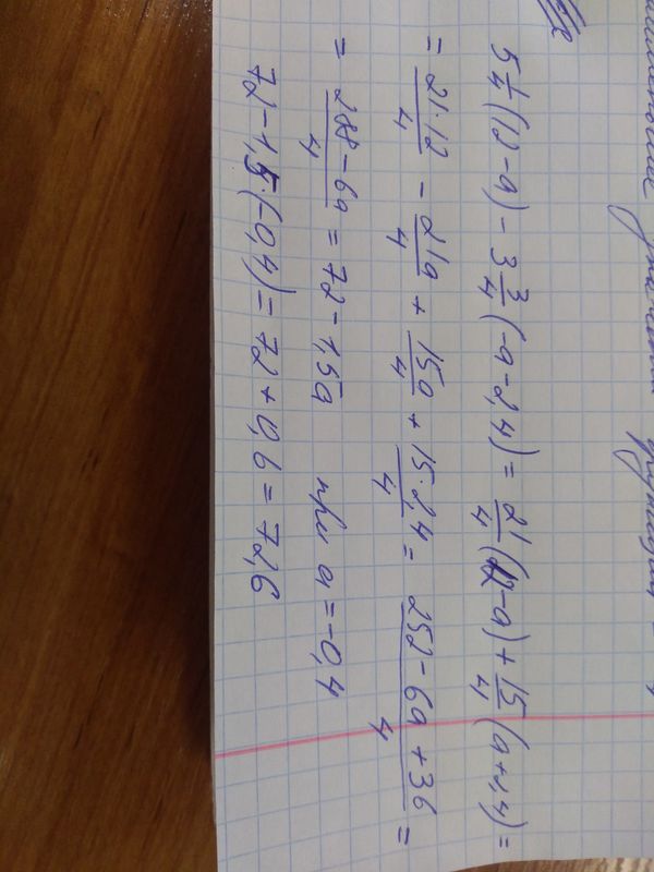 найти значение выражения 5¼(12-а)-3¾(-а-2,4), если а=-0,4