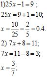 Решите уравнение 1)25х-1=9 ;2) 7х+8=11