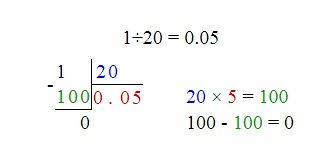 1/20 = 5/20 * 5 = 5/100 = 0,05