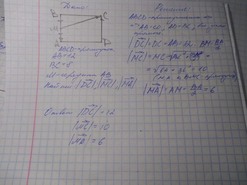 Как решить задачу в прямоугольнике abcd ab =12,bc=8,m- середина стороны ab.найти длины вектора dc mc ma?