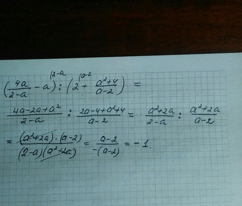 Упростить выражение ( с пояснением ) [tex](\frac{4a}{2-a} -a) : (2+\frac{a^{2}+4 }{a-2} )[/tex]