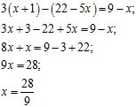 Решите уравнение 3(x+1)-(22-5x)=9-x