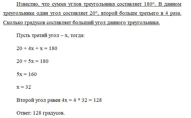 Известно, что сумма углов треугольника составляет 180°. В данном треугольнике один угол составляет 20°, второй больше третьего в 4 раза. Сколько градусов составляет больший угол данного треугольника