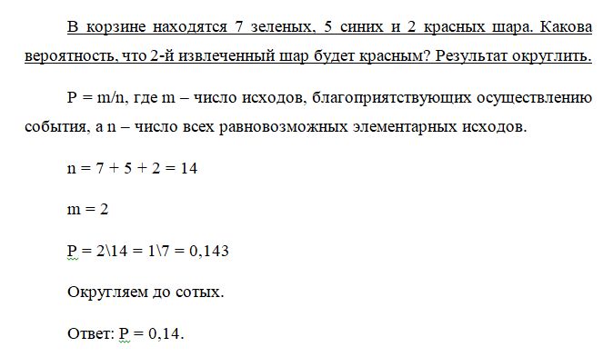 В корзине находятся 7 зеленых, 5 синих и 2 красных шара. Какова