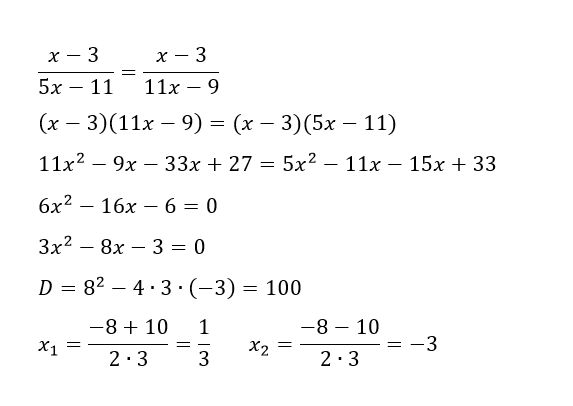 Найти сумму корней уравнения (x-3)/(5x-11)=(x-3)/(11x-9) или корень, если он единственный.