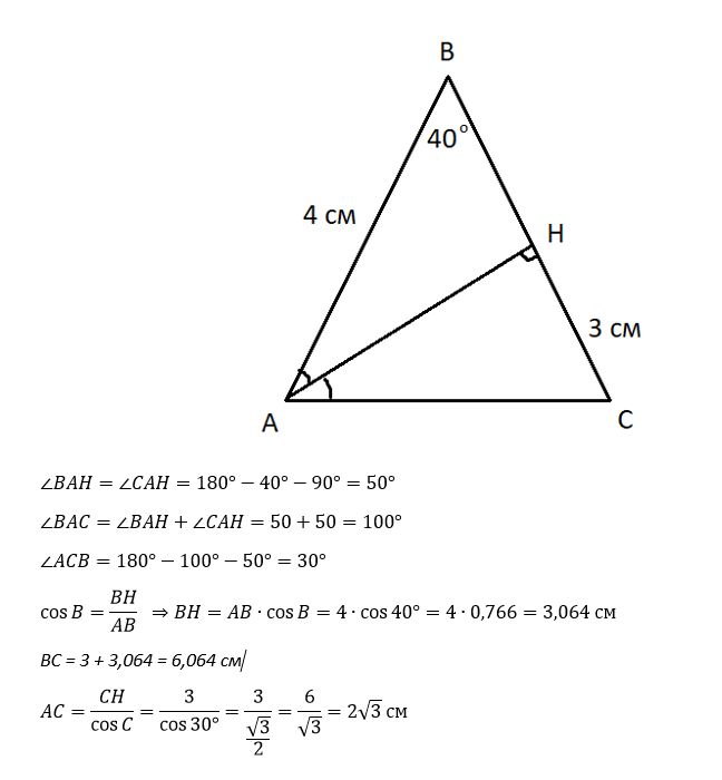 В треугольнике ABC проведена высота AH, причем ∠BAH=∠CAH. Известно, что ∠ABC=40°, AB=4 см, HC=3 см. Найдите все углы и стороны треугольника ABC.
