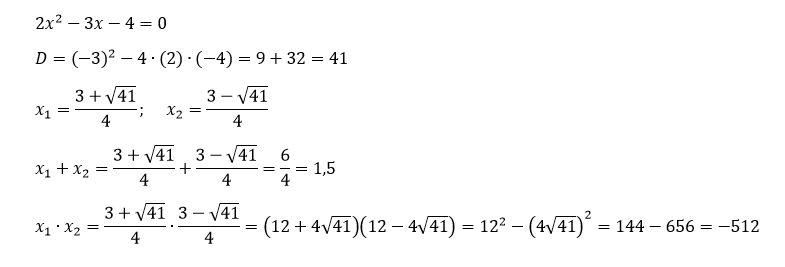Найти сумму и произведение корней уравнения 2х^2 – 3х – 4 = 0.