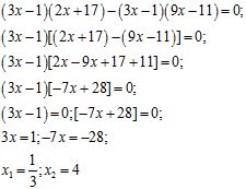Найдите корень в уравнении: (3x-1)(2x+17)-(3x-1)(9x-11)=0