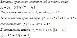 Найдите решение касательно к графику 2 x^2-1 при точке x=3