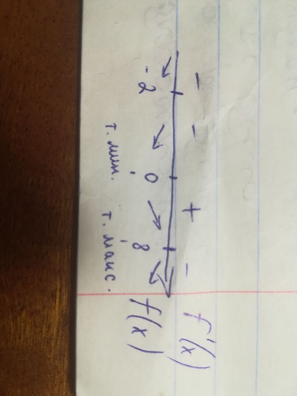 Точки максимума и минимума - это точка на графике, где функция принимает наибольшее или наименьшее значение в окресности данной точки. Точки максимума и минимума являются экстремумами, для их нахождения нужно найти производную функции, и отметить на числовой прямой значения, которые обращают производную в ноль. Затем на полученных отрезках найти какое значение положительноеилиотрицательноеположительное или отрицательноеположительноеилиотрицательное принимает производная. Точка, в которой происходит переход с - на + называется точкой минимума, с + на - точкой максимума.