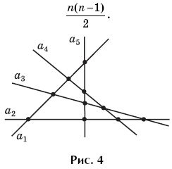 Для n прямых такое кол-во n(n-1)/2, т.к. для двух прямых, очевидно, точек пересечения не более одной (не учитывая совпадающие прямые), и каждая прямая может пересечь все остальные, каждую не более чем в одной точке. Тогда точек пересечения n*(n-1), но каждая посчитана дважды, т.к. образована двумя прямыми. Как нарисовать: рисуем пару перпендикулярных прямых (как оси x и y), потому проводим прямую под 45 градусов к ним, дальше каждую следующую так, чтобы она пересекла оси и все уже нарисованные прямые. На рисунке пример для 5 прямых, шестую можно дорисовать под небольшим наклоном от середины отрезка "оси x" слева от "начала координат" (между a1 и следующей точкой) вверх, чтобы через "ось у" она прошло чуть выше точки a5.