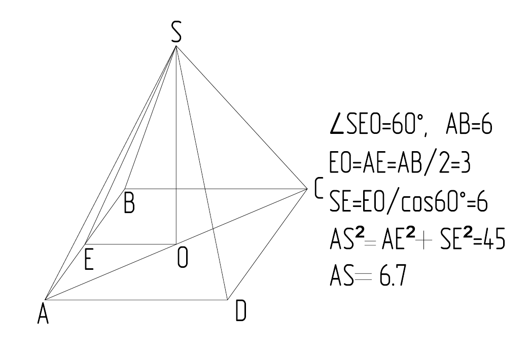 Найти боковое ребро В правильной четырёхугольной пирамиде SABCD сторона основания 6, угол от апофемы к основанию 60°. Найти длину ребра. Как это сделать?