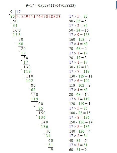 После целого ряда вычислений в остатке вновь появляется 9 и таким образом дробь 9/17 записывается в виде бесконечной периодической десятичной дроби 0,(5294117647058823). Округлим её с точностью до сотых.