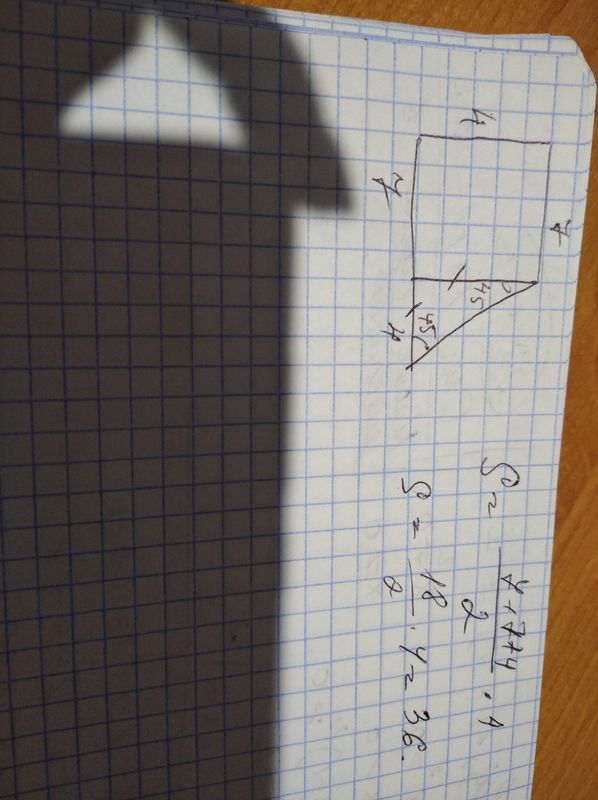 Ребят, выручайте! )1)1)1 Дана прямоугольная трапеция, меньшее основание которой равно 7 см. Меньшая боковая сторона равна 4 см, а большая боковая сторона образует с основанием ∡45°.