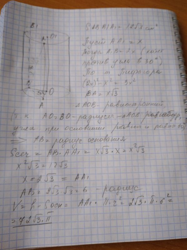 Найдите объем цилиндра. В цилиндре параллельно оси проведена плоскость, пересекающая основание по хорде, которая видна из центра этой основания под углом 60. Площадь сечения, образовавшийся 12 корней из 3 см ^ 2, а угол между диагональю сечения и образующей цилиндра равен 60 °. Найдите объем цилиндра.