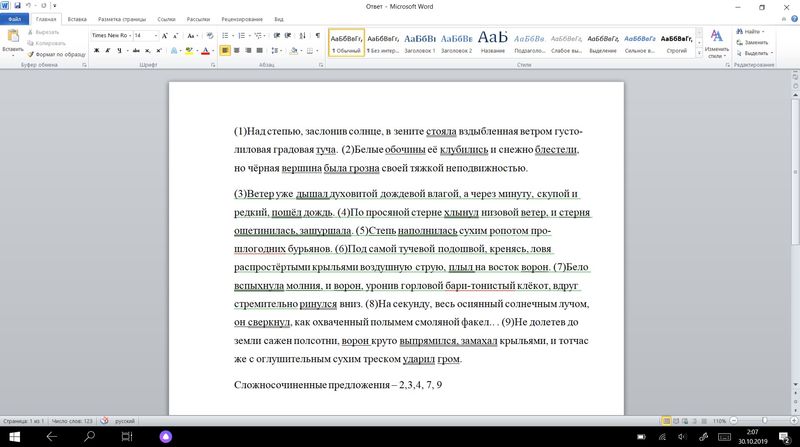 Найдите сложносочиненные предложения и подчеркните главные члены в этом тексте: Над степью, заслонив солнце, в зените стояла вздыбленная ветром густо-лиловая градовая туча. Белые обочины её клубились и снежно блестели, но чёрная вершина была грозна своей тяжкой неподвижностью. Ветер уже дышал духовитой дождевой влагой, а через минуту, скупой и редкий, пошёл дождь. По просяной стерне хлынул ни- зовой ветер, и стерня ощетинилась, зашуршала. Степь наполнилась сухим ропотом про-шлогодних бурьянов. Под самой тучевой подошвой, кренясь, ловя распростёртыми крыльями воздушную струю, плыл на восток ворон. Бело вспыхнула молния, и ворон, уронив горловой бари-тонистый клёкот, вдруг стремительно ринулся вниз. На секунду, весь осиянный солнечным лучом, он сверкнул, как охваченный полымем смоляной факел.. . Не долетев до земли сажен полсотни, ворон круто выпрямился, замахал крыльями, и тотчас же с оглушительным сухим треском ударил гром.