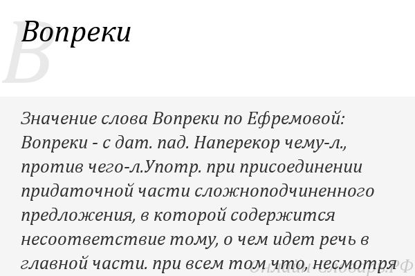 Вопреки значит несмотря ни на что, наперекор всему, против чего-либо.